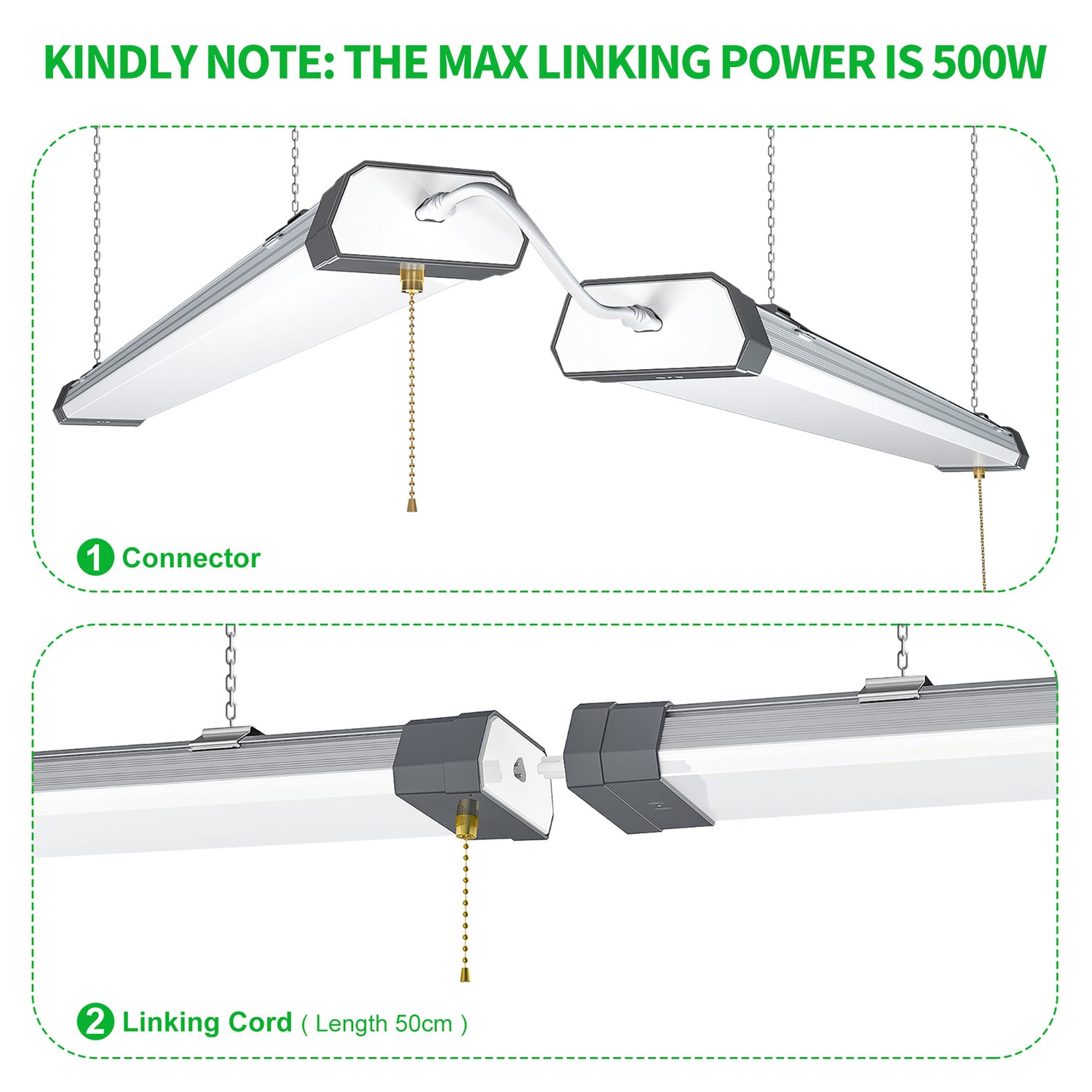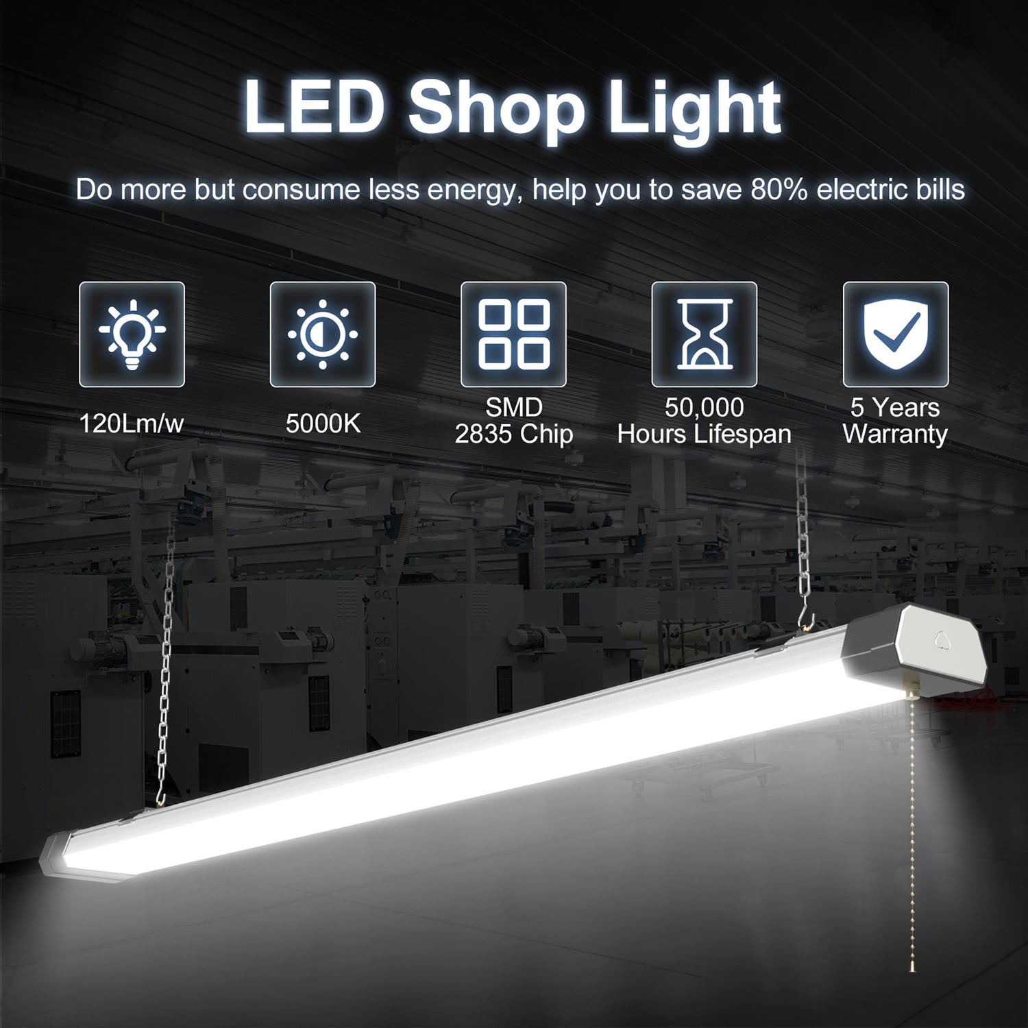 Easy installation with linkable feature: 4' LED shop light fixture features a connectable feature for simple and easy installation. Since up to 6 units can be connected, you can easily extend the range of lighting by connecting multiple lights to create the ideal lighting arrangement without additional wiring or complicated setups. We'll provide all the mounting hardware for LED shop lights you need, no additional purchases are required and installation is simple. Also, we will provide extension chains to help you make positional adjustments for a variety of scenes and locations. The switch is controlled via a pull ring, not only increasing the aesthetic but also convenient for you to handle.