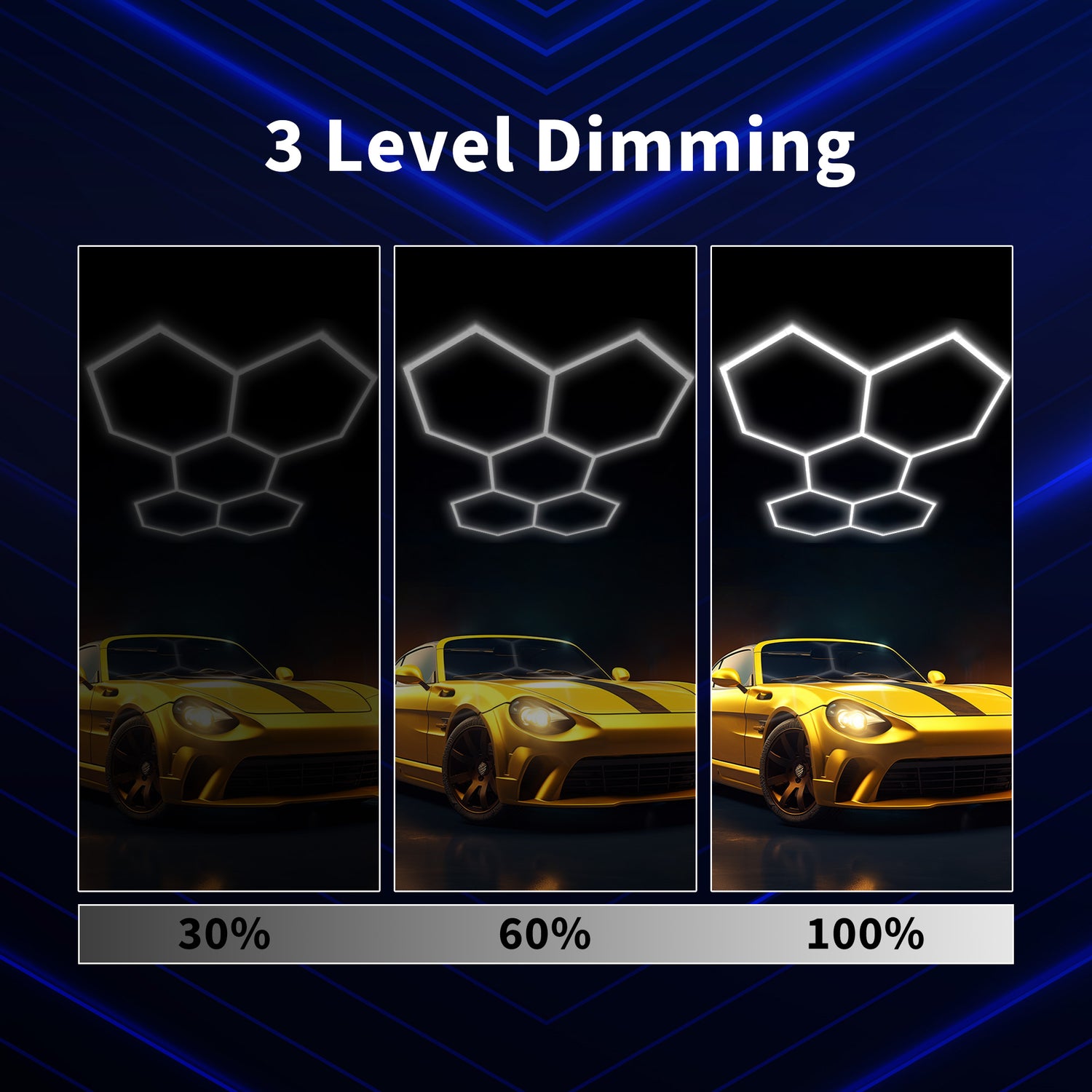 Adjustable brightness:The LED honeycomb lights deliver superior brightness with a dimmable design for customizable lighting. Suitable for garages, gyms, shops, basements, and other indoor spaces, they provide eye-friendly illumination from 30% to 100%, ensuring brilliant light that remains comfortable throughout the day.