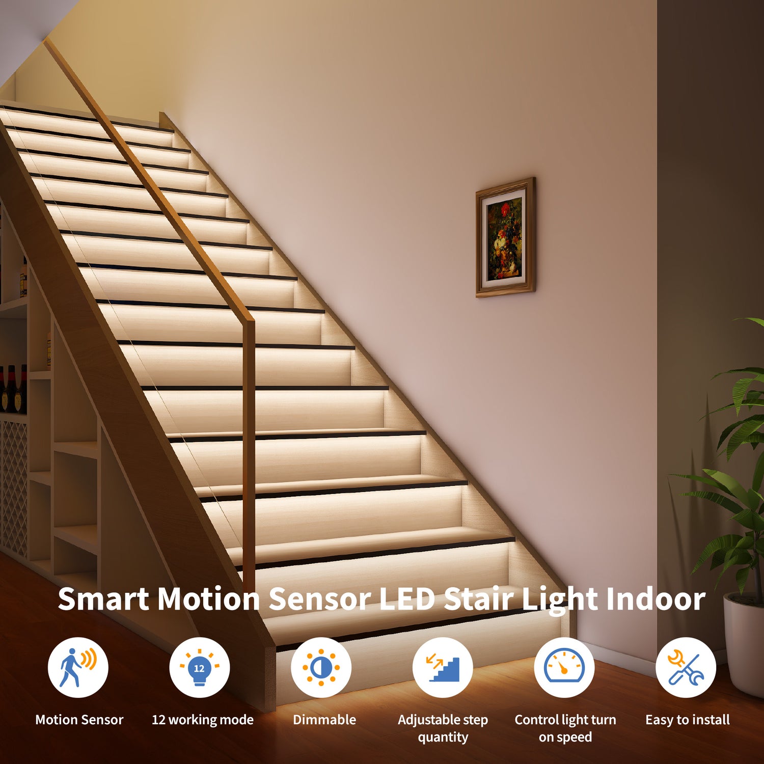 Multiple Mode with Motion Sensor: LED step lights are designed with motion sensors for smart sensing, improving convenience and safety, especially in dark environments. You don't have to turn on the low-voltage step lights yourself, as long as the sensor senses you, it will light up. This stair lighting typically has a variety of modes, usually around 12 different Settings, giving users a variety of options for customizing lighting effects. Whether in cascade or static mode, this stair with lights creates the perfect atmosphere for every occasion, from a relaxing night out to a festive party!