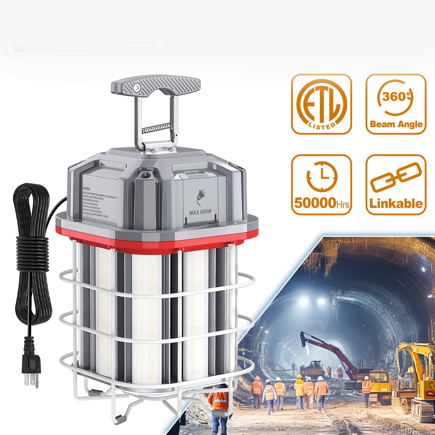 Wide Application: LED construction light is perfect for a variety of uses including construction sites, warehouses, outdoor events, and maintenance. They can cope with harsh conditions and are water and dust-resistant, so they work well both indoors and outdoors. At the same time, these portable work lights provide 360° and 140lm/w of illumination, yet are easy to install, portable, and can be linked together to cover a larger area, making temp lighting perfect for fast and reliable lighting in a variety of environments.