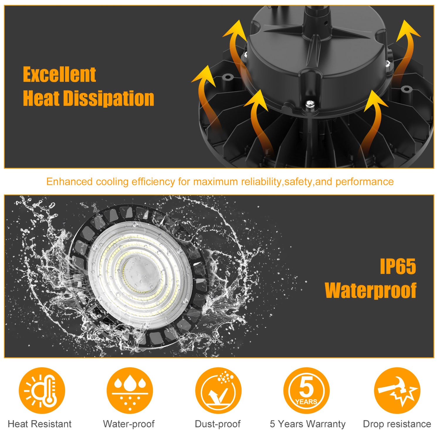 Superior Materials & Design: The ceiling high bay lights are made of metal and dust resistant materials. Specifically, the cover of black ceiling LED high bay lighting are made from dia-cast aluminum for excellent strength and heat dissipation. The led chip is protected by a PC lens, which allows UFO LED lights to work hard for longer time, prolonging its life, and especially suitable for wet (IP65)or outdoor environments.