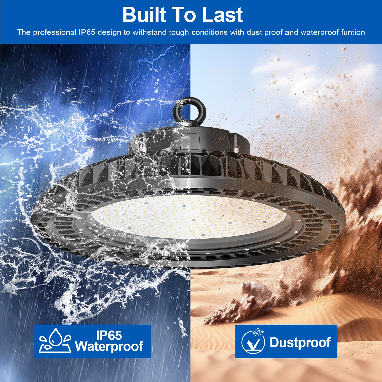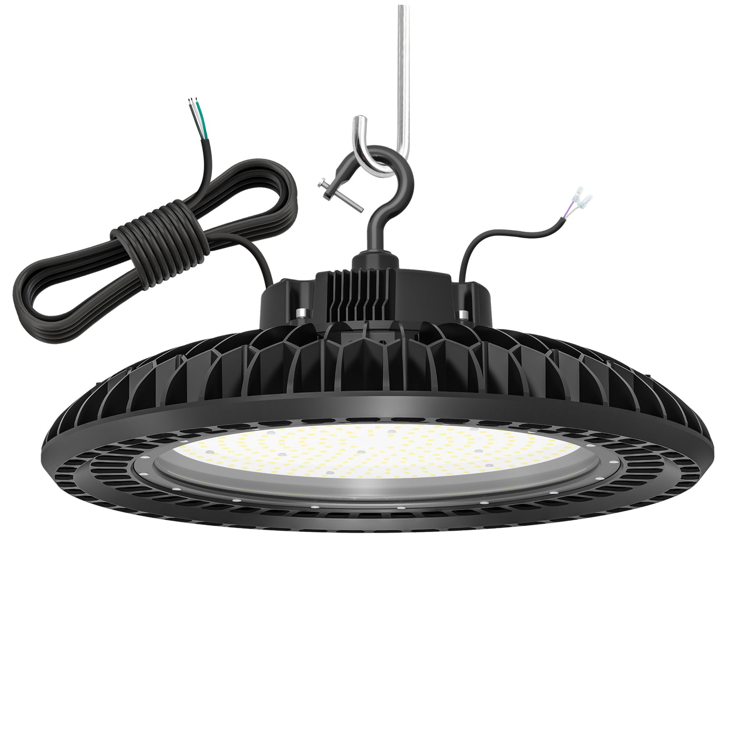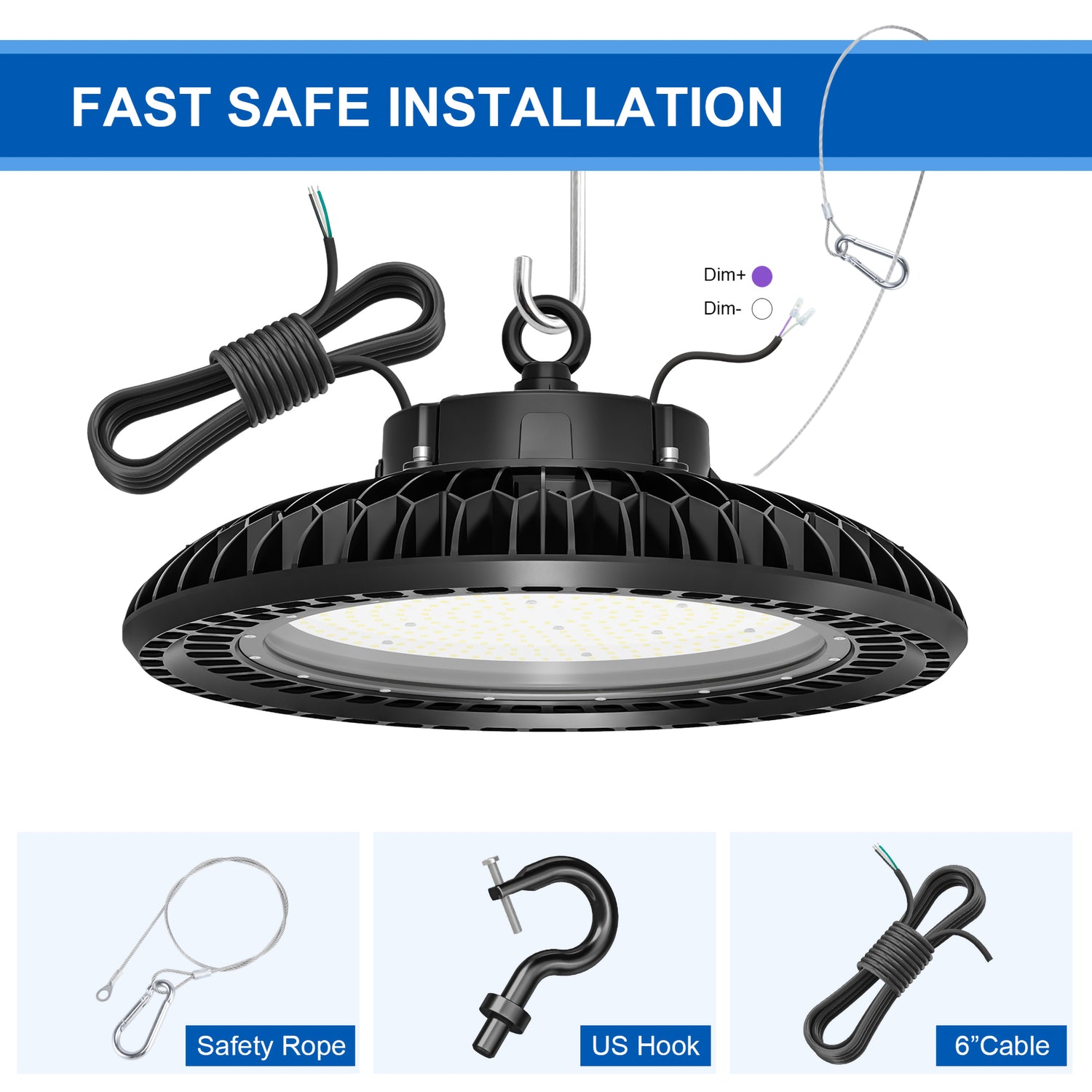 Waterproof and durable: The ceiling high bay lights are made of metal and dust resistant materials. Specifically, the cover of black ceiling LED high bay lighting are made from dia-cast aluminum for excellent strength and heat dissipation. The led chip is protected by a PC lens, which allows UFO LED lights to work hard for longer time, prolonging its life, and especially suitable for wet or outdoor environments.