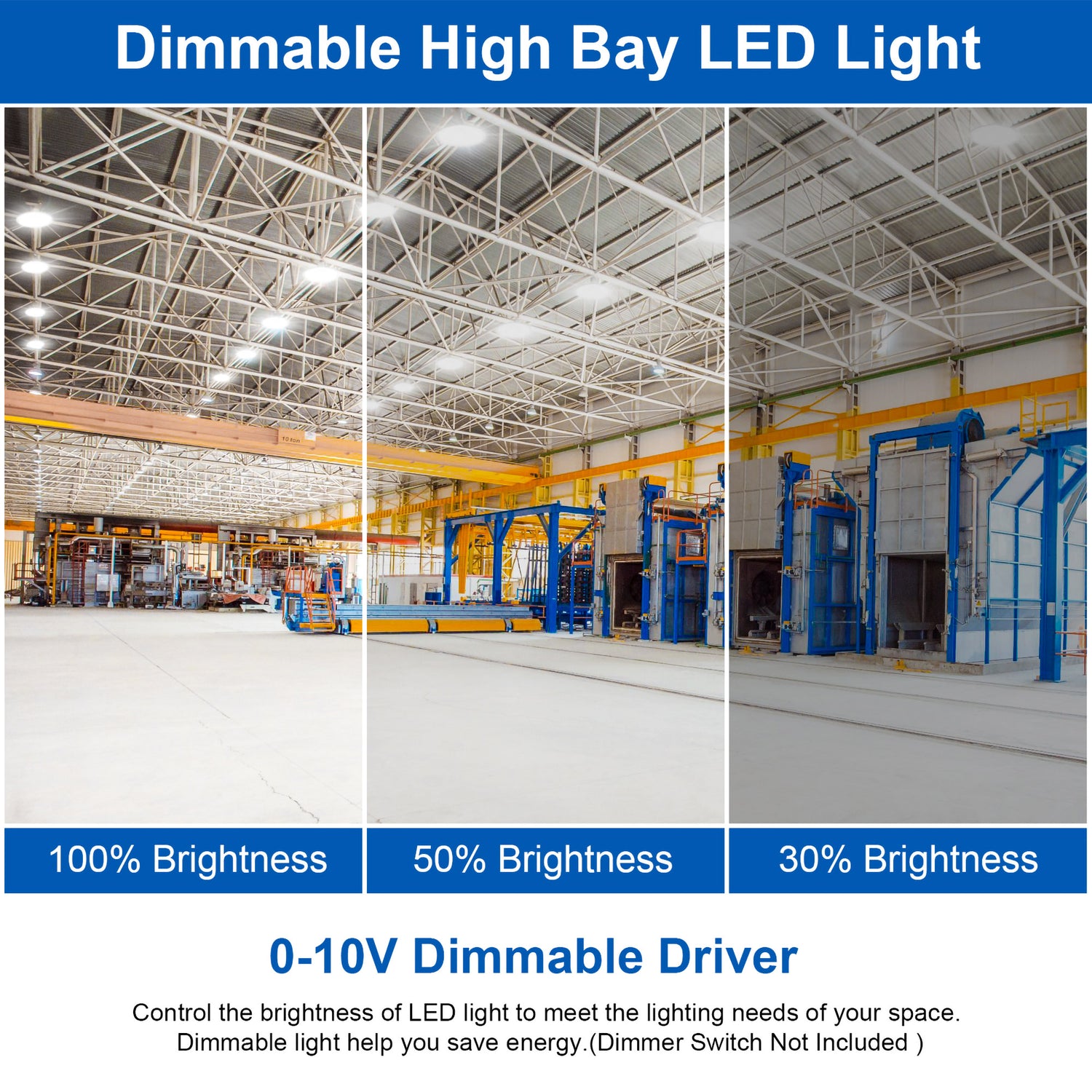 High- level Brightness: High bay LED lights, as a low cost high lumen lighting, provide 140lm/w and stable brightness with no flicker, illuminating wide space with 120°beam angle. Besides this, LED high bay light has two options for you to choose the one UFO high bay light that best suits your needs. To be more specific, we can offer adjustable brightness of high bay LED lighting from 0 to 10v, 3 levels of brightness, or 3 different CCT (color temperature), ranging from warm soft white (3000k) to daylight white (5000k). So, you can choose the most suitable UFO lights to deal with your lighting problems.