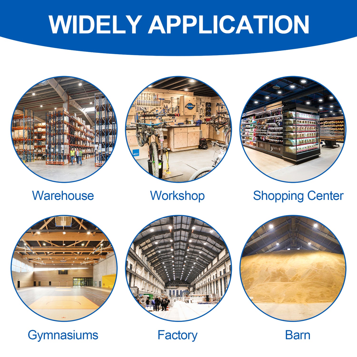 Wide Application: With stable brightness and wide beam angle, UFO LED high bay light provides stable and high-lumen lighting. The simple shape and design, as well as the excellent materials make industrial LED high bay lighting last longer than most lights as well. Thus, UFO lights led are widely used for large areas, such as such as appling in led warehouse lighting, gym lighting, and industrial lighting.