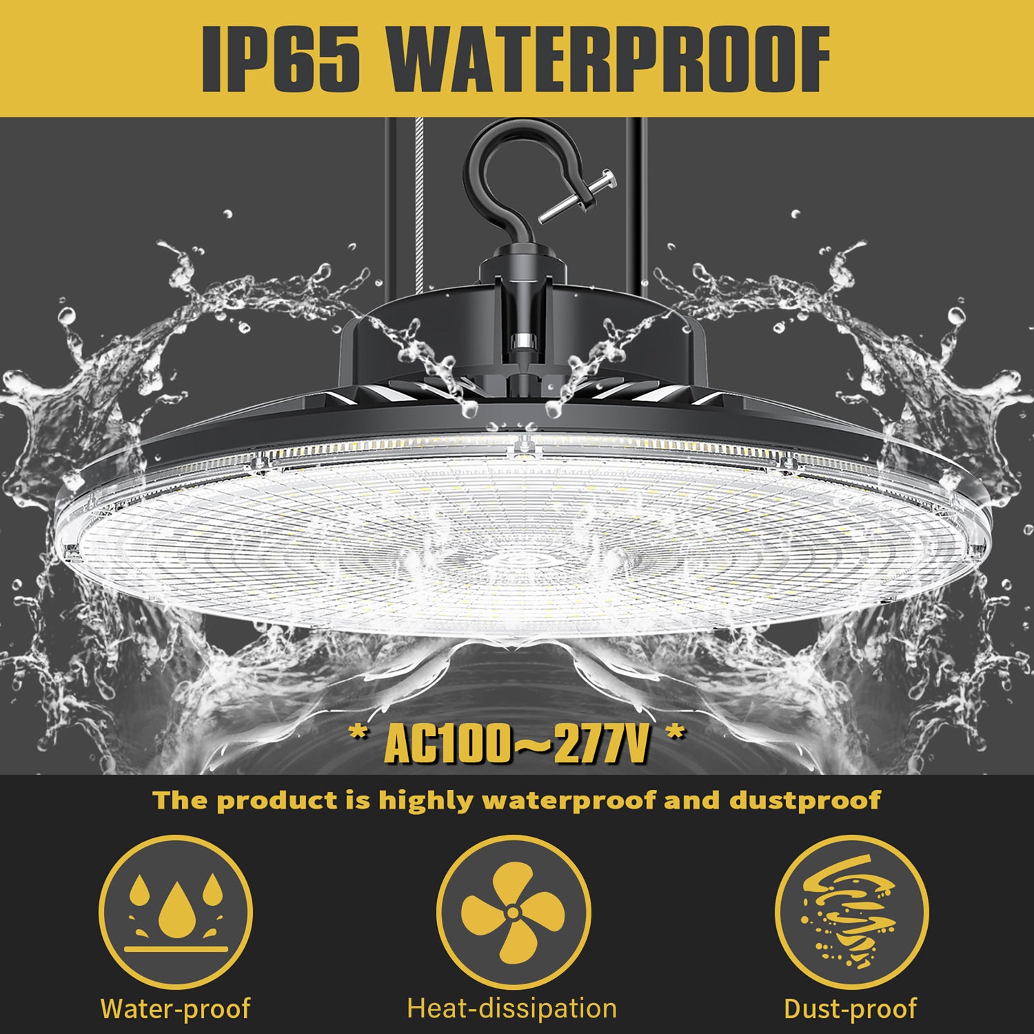 Superior Materials & Design: The ceiling high bay lights are made of metal and dust resistant materials. Specifically, the cover of black ceiling LED high bay lighting are made from dia-cast aluminum for excellent strength and heat dissipation. The led chip is protected by a PC lens, which allows UFO LED lights to work hard for longer time, prolonging its life, and especially suitable for wet (IP65)or outdoor environments.