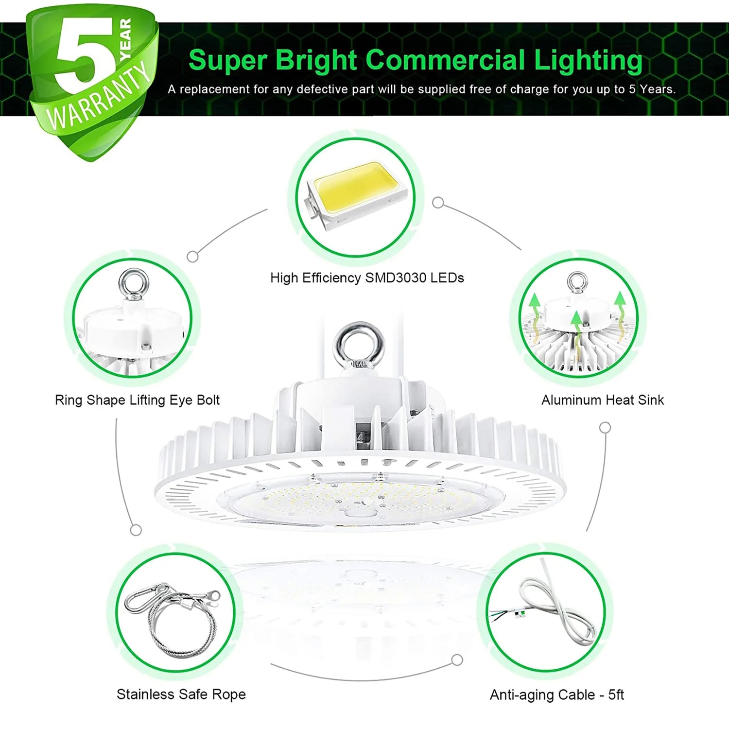 Superior Materials & Design: The ceiling high bay lights are made of metal and dust resistant materials. Specifically, the cover of black ceiling LED high bay lighting are made from dia-cast aluminum for excellent strength and heat dissipation. The led chip is protected by a PC lens, which allows UFO LED lights to work hard for longer time, prolonging its life, and especially suitable for wet (IP65)or outdoor environments.
