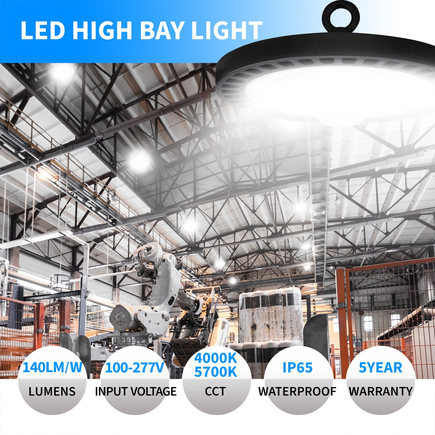 Superior Materials & Design: The ceiling high bay lights are made of metal and dust-resistant materials. Specifically, the cover of black ceiling LED high bay lighting are made from dia-cast aluminum for excellent strength and heat dissipation. The led chip is protected by a PC lens, which allows UFO LED lights to work hard for longer time, prolonging its life, and especially suitable for wet (IP65)or outdoor environments.
